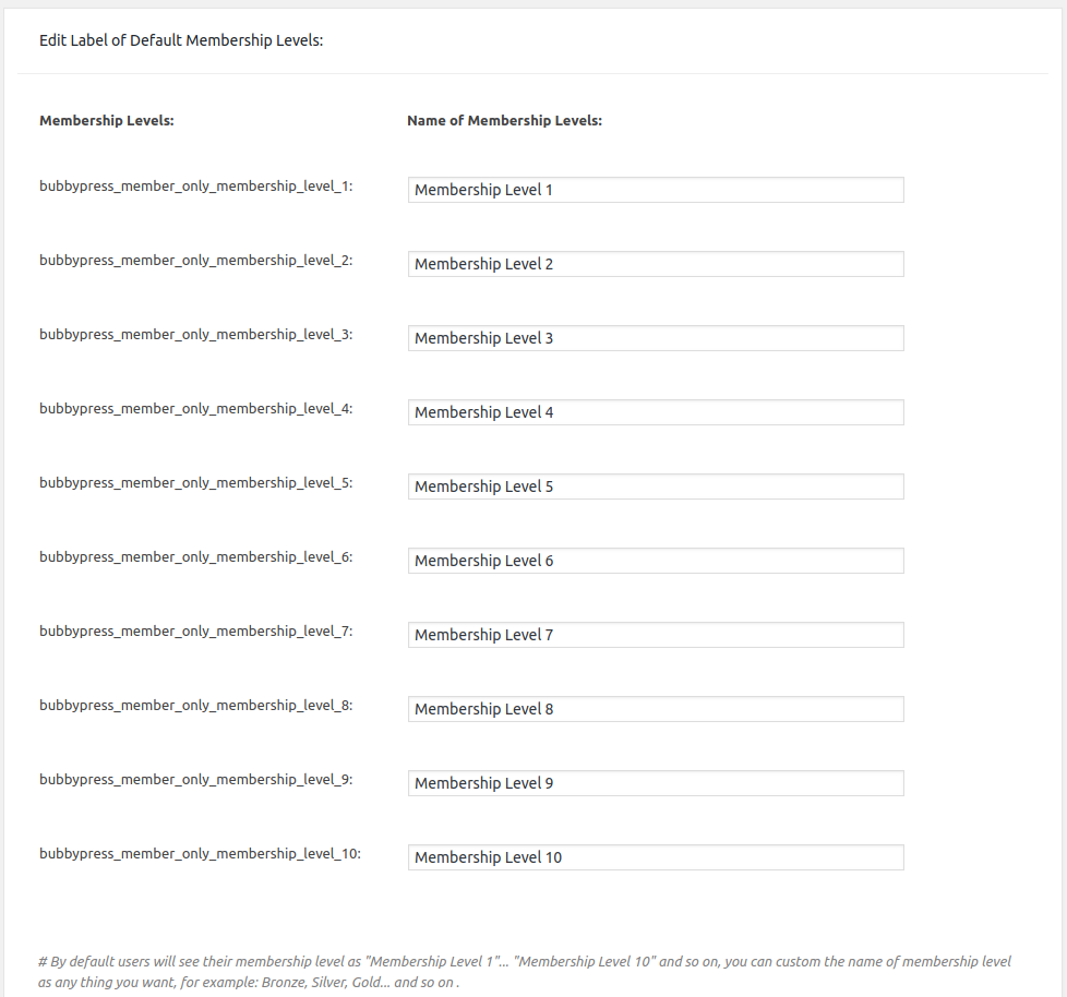 * Edit Label of Default Membership Levels, By default users will see their membership level as “Membership Level 1″… “Membership Level 10” and so on, you can custom the name of membership level as any thing you want, for example: Bronze, Silver, Gold… and so on